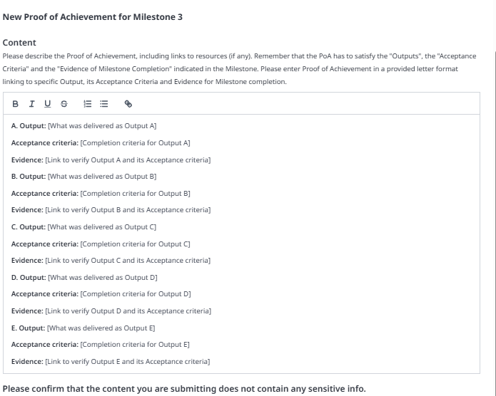 A standardized template has been introduced for both Milestone and Proof of Achievement (PoA) submission.