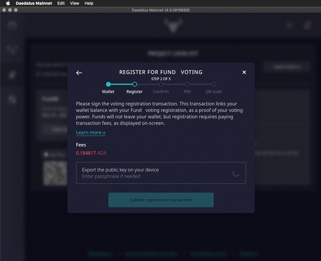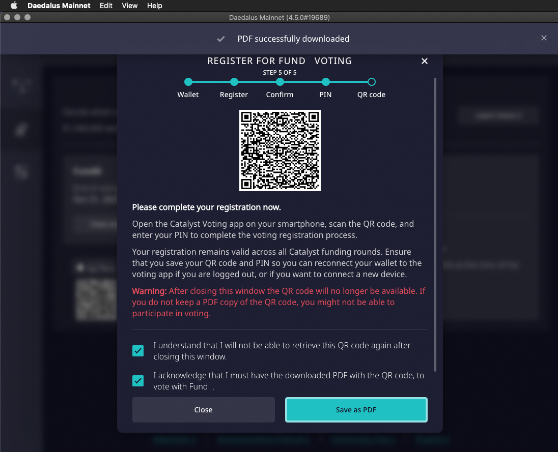 Daedalus will generate a QR code that you will use on Catalyst App to complete the registration and to cast your votes.