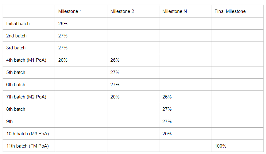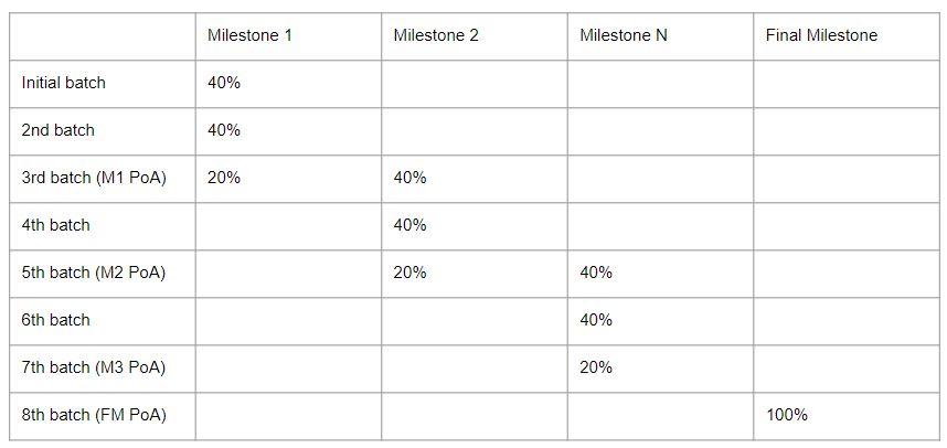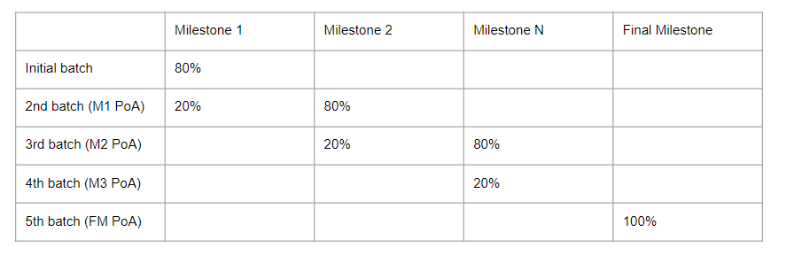 Each individual Milestone is paid 80% of its budget before completion (equally divided by Milestone length) and 20% upon completion (on submission and approval of the PoA for that specific milestone). The Final Milestone is 1-month long and is paid upon completion.